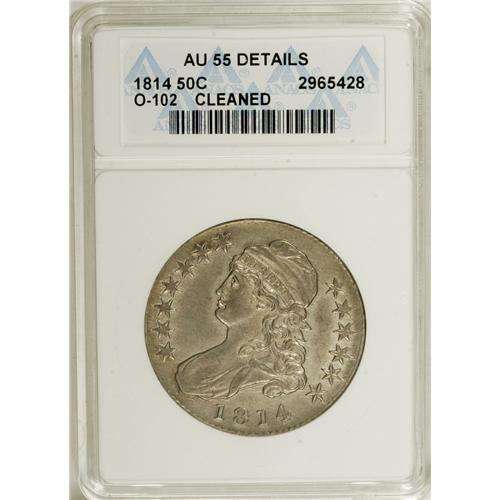 <B>1814 50C --Cleaned--ANACS. AU55 Details.</B></I> O-102. NGC Census: (39/185). PCGS Population (45/144). Mintage: 1,039,075. Numismedia Wsl. Price for NGC/PCGS coin in AU55: $550. (#6105)<BR><BR><b>Shipping:</b> Coins & Currency (<a target="_blank" href="http://www.heritageauctions.com/common/shipping.php">view shipping information</a>)