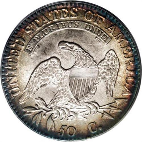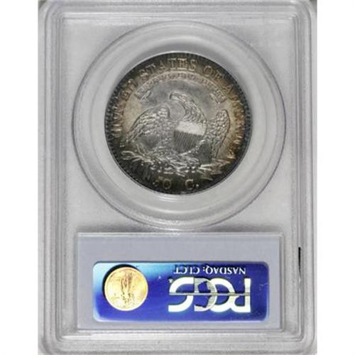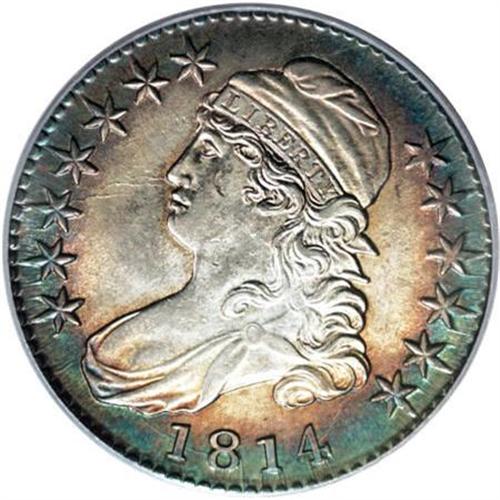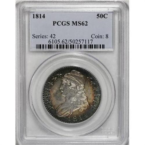 <B>1814 50C MS62 PCGS.</B></I> O-104a, R.2. The low second 1 in the date, the center dot on crossbar 5, and the low 50 C. confirm the variety, while the obverse and reverse cracks affirm the later die state. Soft luster emanates from silver-gray surfaces that yield cobalt-blue, lavender, and gold-tan peripheral patination. A solid strike brings out nice detail on the motifs. A few minute marks occur on Liberty's portrait. A sharp Capped Bust half dollar.<BR><BR><B>Coin Engraver:</B> John Reich<BR><BR><b>Shipping:</b> Coins & Currency (<a target="_blank" href="http://www.heritageauctions.com/common/shipping.php">view shipping information</a>)