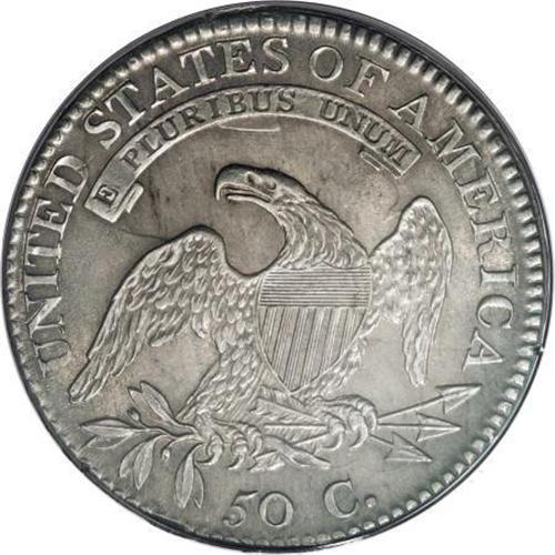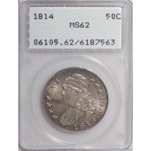 <B>1814 50C MS62 PCGS.</B></I> O-109, R.2. Walnut-brown and gunmetal-gray alternate across this lustrous example. The toning deepens slightly across the reverse border. Surprisingly smooth aside from a tick on the cheekbone. The reverse is well preserved. Struck from strongly clashed dies, and housed in a first generation holder.<BR><BR><B>Coin Engraver:</B> John Reich<BR><BR><b>Shipping:</b> Coins & Currency (<a target="_blank" href="http://www.heritageauctions.com/common/shipping.php">view shipping information</a>)