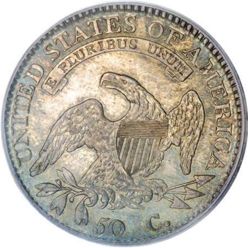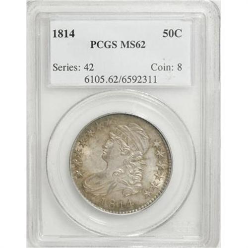 <B>1814 50C MS62 PCGS. CAC.</B></I> O-104, R.1. The wide gap between 50 and C helps identify this Overton variety. This shimmering representative is mostly smoky golden-brown, although aquamarine tints accompany selected areas of the margins. Alertly struck despite minor incompleteness on the claws and upper left stars. Well preserved aside from a faint vertical slide mark on the portrait.<BR><I>From The Mario Eller Collection, Part Two.</B></I><BR><BR><B>Coin Engraver:</B> John Reich<BR><BR><b>Shipping:</b> Coins & Currency (<a target="_blank" href="http://www.heritageauctions.com/common/shipping.php">view shipping information</a>)