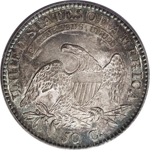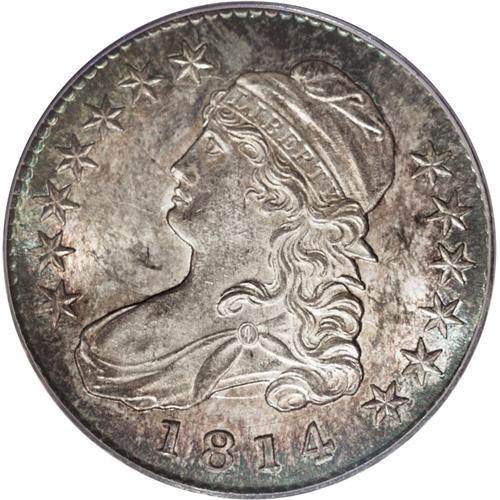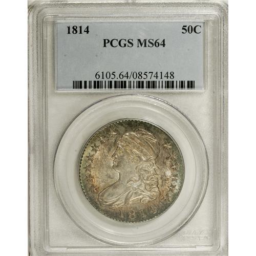 <B>1814 50C MS64 PCGS.</B></I> O-109, R.2. A well-detailed example with ivory mint frost that is accented by rose, green, and iridescent toning close to the borders. The overall color scheme is somewhat darker on the reverse. Population: 24 in 64, 10 finer (4/07) for all 1814 varieties combined.<BR><BR><b>Shipping:</b> Coins & Currency (<a target="_blank" href="http://www.heritageauctions.com/common/shipping.php">view shipping information</a>)