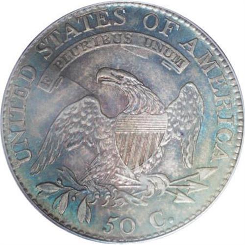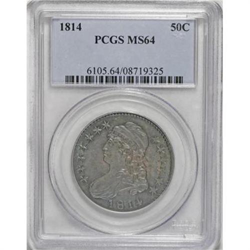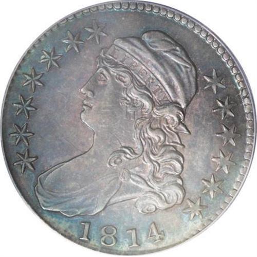<B>1814 50C MS64 PCGS.</B></I> O-105, R.2. Deep ocean-blue and plum-red toning envelops this satiny Capped Bust half. The strike is precise aside from the right-side star centers and minor incompleteness on the eagle's right (facing) claw. The dies are boldly clashed, as usual for this Overton marriage. Population: 25 in 64, 10 finer (8/07).<BR><BR><B>Coin Engraver:</B> John Reich<BR><BR><b>Shipping:</b> Coins & Currency (<a target="_blank" href="http://www.heritageauctions.com/common/shipping.php">view shipping information</a>)