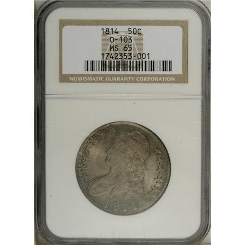 <B>1814 50C MS65 NGC.</B></I> O-103, R.1. A vertical die break (as made) connects the wing to the left scroll end. A deep lilac-gray Gem with comprehensive luster and beautifully unabraded surfaces. Sharply impressed and undeniably pleasing. Struck from multiply and heavily clashed dies, as usual for this interesting die marriage.<BR><BR><b>Shipping:</b> Coin/Currency (<a target="_blank" href="http://www.heritageauctions.com/common/shipping.php">view shipping information</a>)