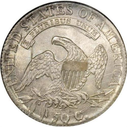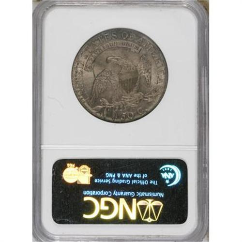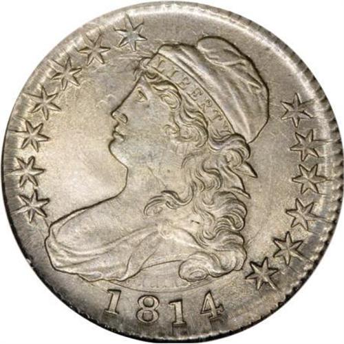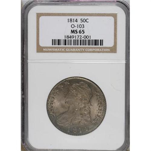 <B>1814 50C MS65 NGC.</B></I> O-103, R.1. This Overton marriage is easily identified by the vertical die break between the left scroll end and the nearby wing. Both sides also exhibit multiple sets of bold clash marks. Luster sweeps the olive, ice-blue, and dove-gray surfaces. Despite the advanced die state, the devices are precisely brought up, with the sole exception of the eagle's right (facing) claw.<BR><BR><B>Coin Engraver:</B> John Reich<BR><BR><b>Shipping:</b> Coins & Currency (<a target="_blank" href="http://www.heritageauctions.com/common/shipping.php">view shipping information</a>)