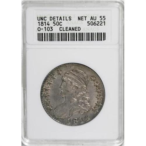 <B>1814 50C --Cleaned--ANACS. Unc. Details, Net AU55.</B></I> O-103, R.1. Specialists can identify this variety at first glance, because of its heavy die crack beneath the left scroll end. The strike is sharp except for the right (facing) claw, and the satiny steel-gray surfaces are smooth apart from a few wispy hairlines.<BR><BR><B>Coin Engraver:</B> John Reich<BR><BR><b>Shipping:</b> Coins & Currency (<a target="_blank" href="http://www.heritageauctions.com/common/shipping.php">view shipping information</a>)