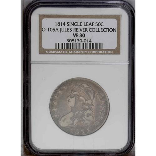 <B>1814<50C> VF30 NGC.</B></I> O-105a, R.4. Single leaf late die state. This variety was produced from a die pair that was reworked to remove all but a few clash marks. Those that remain include bold shield stripes on the obverse around Liberty's ear. Dappled gray, beige, and apricot-red surfaces with the usual weakness at the margins. Several wispy pinscratches are evident on Liberty's face, using a magnifier. Envelope Included.