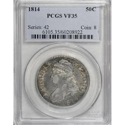 <B>1814 50C VF35 PCGS.</B></I> . PCGS Population (8/305). NGC Census: (11/35613). Mintage: 1,039,075. Numismedia Wsl. Price for NGC/PCGS coin in VF35: $203. (#6105)<BR><BR><B>Coin Engraver:</B> John Reich<BR><BR><b>Shipping:</b> Coins & Currency (<a target="_blank" href="http://www.heritageauctions.com/common/shipping.php">view shipping information</a>)