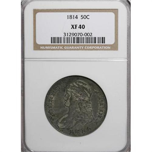 <B>1814 50C XF40 NGC.</B></I> NGC Census: (15/36072). PCGS Population (33/275). Mintage: 1,039,075. Numismedia Wsl. Price for NGC/PCGS coin in XF40: $250. (#6105)<BR><BR><B>Coin Engraver:</B> John Reich<BR><BR><b>Shipping:</b> Coins & Currency (<a target="_blank" href="http://www.heritageauctions.com/common/shipping.php">view shipping information</a>)