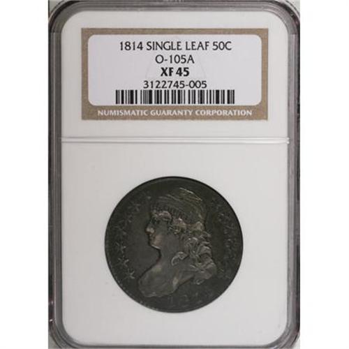 <B>1814 50C Single Leaf XF45 NGC.</B></I> O-105A. NGC Census: (48/35559). PCGS Population (31/243). Mintage: 1,039,075. Numismedia Wsl. Price for NGC/PCGS coin in XF45: $320. (#6105)<BR><BR><B>Coin Engraver:</B> John Reich<BR><BR><b>Shipping:</b> Coins & Currency (<a target="_blank" href="http://www.heritageauctions.com/common/shipping.php">view shipping information</a>)