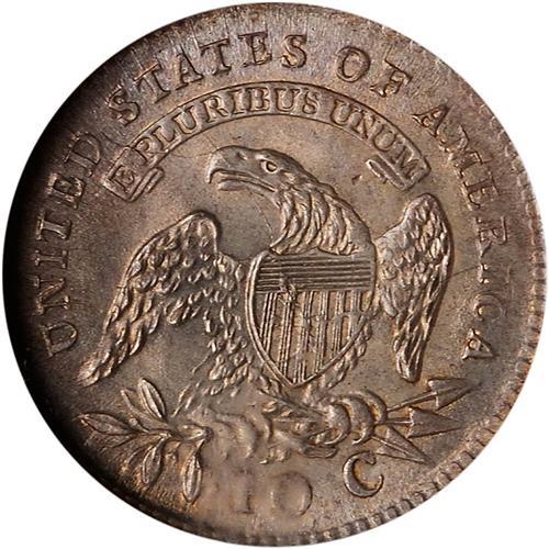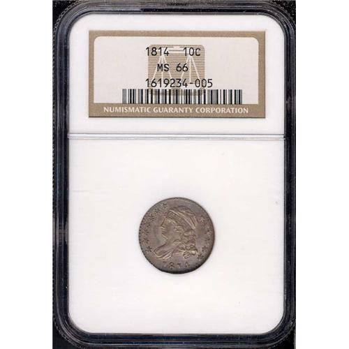 Attractive original toning over fresh silver fields. Typical in strike, with some lightness on the stars and centers. Most dimes of the 1814 date show significant wear, few are left in their original mint condition, fewer still as exceptional as this Mint State 66. A pleasing exception to all the usual problems one finds on these early bust dimes!