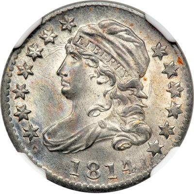 Five die varieties are known among the dimes of 1814, created through a combination of three obverse and four reverse dies. The recorded mintage was 421,500 coins all produced from the second through fourth quarters of the year. We are confident that this is the total mintage of dimes bearing this date as no examples of this denomination were struck from 1815 through 1819.