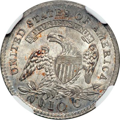 "The reverse bore an American eagle with head turned left, holding three arrows symbolizing strength, and an olive branch representing peace. On its breast is the U.S. Shield composed of six horizontal lines indicating blue, with 13 stripes below, six of these made of three vertical lines indicating red. Such lines were an 18th century engraver's standardized method of showing colors in black-and-white engravings; blue representing dominion, red signifying force, with white denoting purity. Encircling the top of the eagle is the inscription UNITED STATES OF AMERICA, and a scroll with the incuse motto E PLURIBUS UNUM. Beneath the eagle is the denomination 10 C. When grading this series, take into account that weak strikes are common. On the obverse, wear will first show on the drapery at the front of the bust, the hair at the forehead and above the ear and the shoulder clasp. On the reverse, check the eagle's claws, neck, and wings.