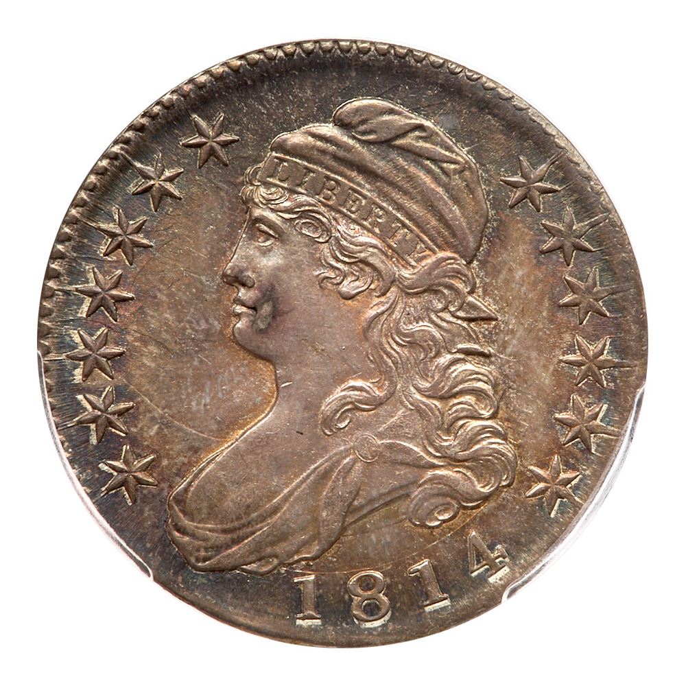 1814. PCGS graded MS-65. Boldly struck with lovely toning. The differences between Overton-104 Rarity 1 and Overton-104a Rarity 4 are some die cracks which are not yet present. We see clash marks on both sides, but no die cracks as of yet. Should be send in for variety attribution. Dusky orange-gold toning with vibrant luster peeking out from the fields. The strike is sharp on all the devices, and more importantly the surfaces are clean and fresh. A formidable example of this earlier die state and one which should entice the attention of specialists.Pop 14; 7 finer for the date at PCGS. PCGS # 6105 Estimated Value 9,000 - 10,000