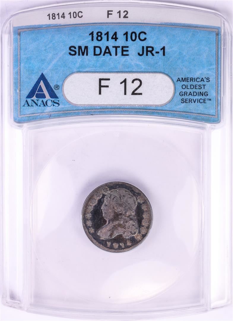 One 1814 Capped Bust Small Date Dime Coin ANACS F12 JR-1. ANACS Certified.