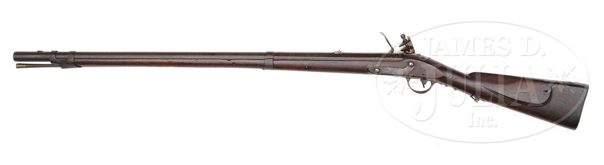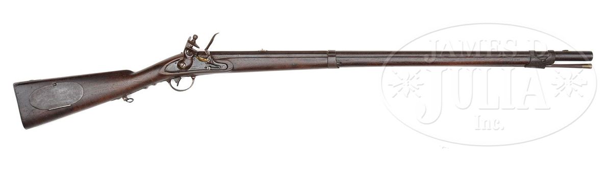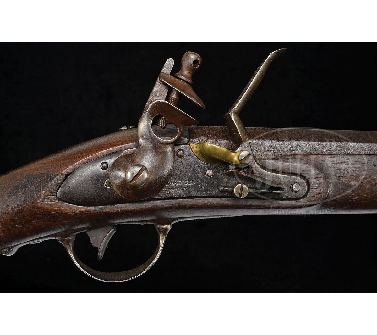 NSN. .68 Cal. (smooth) x 35-3/8" reconverted long part oct (11") part rnd bbl marked "H. DERINGER/PHILADa" in two lines, on left breech flat is a "F" (George Flegel)"P". Rear sight is located 5-3/16" from breech, front sight is located 2" behind muzzle. Front and rear bbl bands, trigger guard, buttplate, implement box and sideplate are all proper pattern and orig to this piece. Brass tipped steel ramrod is 35-1/2". 5-3/8" long lock is marked under brass pan "H. DERINGER" / "PHILA" in two lines. American black walnut stock is 45-3/4" long. CONDITION: All iron work has a deep patina with moderate to heavy pitting in touch hole area. Rear sight is a modern replacement. Lock has been reconverted back to flint with good color and parts fitted well. Rear sling swivel mounted to back of trigger guard as is proper, however there is not front sling swivel, which would mount to a middle band, but this gun has never had provisions for a middle band. Stock is in overall very good condition having a 3/4" long stress fracture at rear lockplate screw. 4" long x 3/4" wide piece of wood replaced between lock and bbl tang, on the off lock side is a 2" long x 1" crack that has been repaired. 4-49304