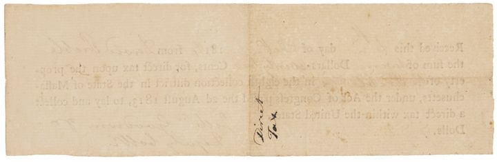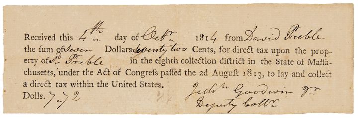 Docket on the blank reverse reads, “Direct Tax” bill for David Preble dated 1813 (Berwick, Maine), “under the Act of Congress passed the 2nd August 1813, to lay and collect a direct tax within the United States.” This boldly printed, well centered form is completed in deep brown upon very clean, laid period paper. A very rare Direct Tax form towards paying expenses during the War of 1812 and the very first of this early American war-date tax form we have seen.