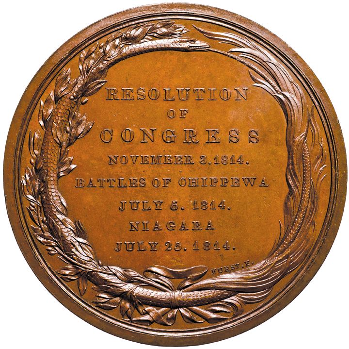 Julian MI-20. 65mm. The Obverse shows a Tall youthful bust of General Winfield Scott facing right. The Reverse has a Wreath and an “Eternity” Symbol of a Serpent with its tail in its mouth, which surrounds and encloses his Congressional Resolution for Bravery at Chippewa and Niagara. This original die is identified by the date “JULY 5,” which is punched over 4. A nice medal having and sharp strike, wire rims, that is rich natural brown, having no marks.