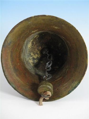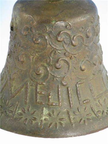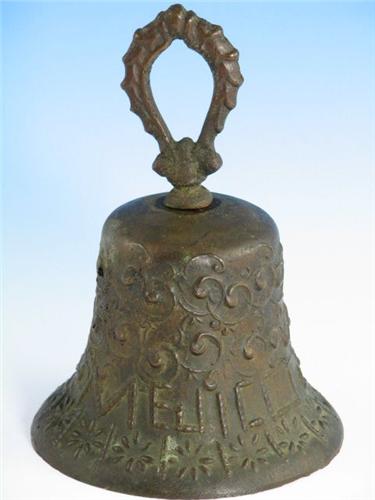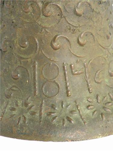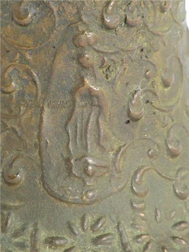1814, Mexico Cast Bronze Bell. Features hand-made cast bronze, decorated with image of the Virgin Mary and child, swirl design and flower or sun motif around edge, original clapper and handle, great patina. Marked: "1814 Mejico". Dimensions: 7"H x 4.75"D.