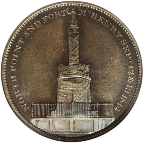 <B>1814 North Point & Fort McHenry PR65 Brown NGC.</B></I> Baker-324AA, R.8. Copper. Plain edge, per NGC attribution. This well struck medal has pleasing reflectivity. The chocolate-brown surfaces reveal ocean-blue and rose hues once angled beneath a light. The fields exhibit faint hairlines.