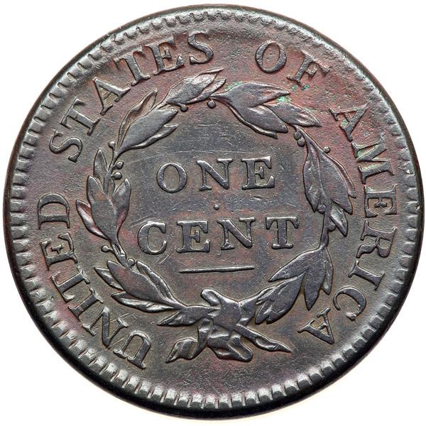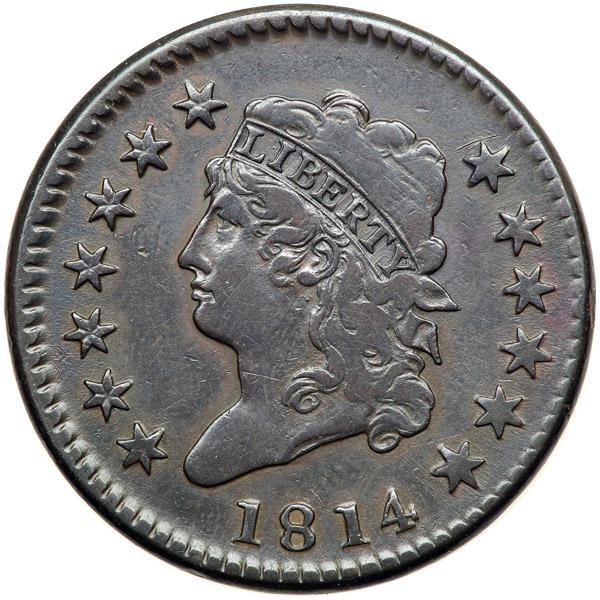 1814 S-294 R1 Crosslet 4 F12. Turban Head. Sharpness VF20 but there is some very light corrosion at the top of the reverse affecting TES-OF-AM, and a few microscopic specks of verdigris can be found in that area. The remainder of the planchet is smooth and attractive with only minor contact marks, including faint hairlines on the portrait. Glossy dark steel and olive with frosty lighter steel brown toning in protected areas and reddish chocolate toning in the roughened area at the top of the reverse. LDS, Breen state II.
