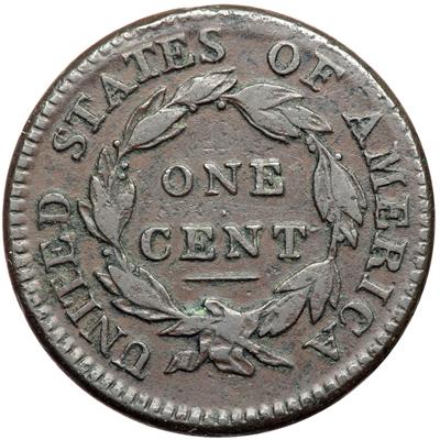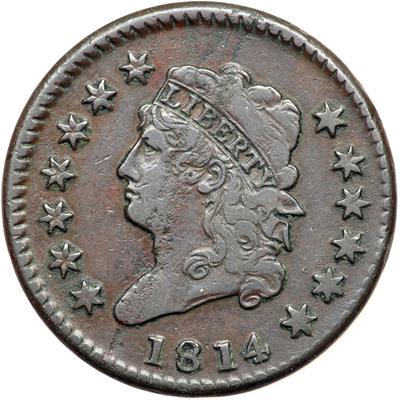 1814 S-294 R1. Fine-15. Turban Head. Crosslet 4. Ten points sharper with a streak of planchet roughness across the obverse from the dentils above the head to the dentils under the bust tip. The remainder of the planchet is relatively smooth and presents good eye appeal. No notable contact marks, just traces of crud nestled into some of the most-protected areas. Slightly glossy chocolate brown with steel brown toning on the devices. MDS. Struck slightly off center to K-4.