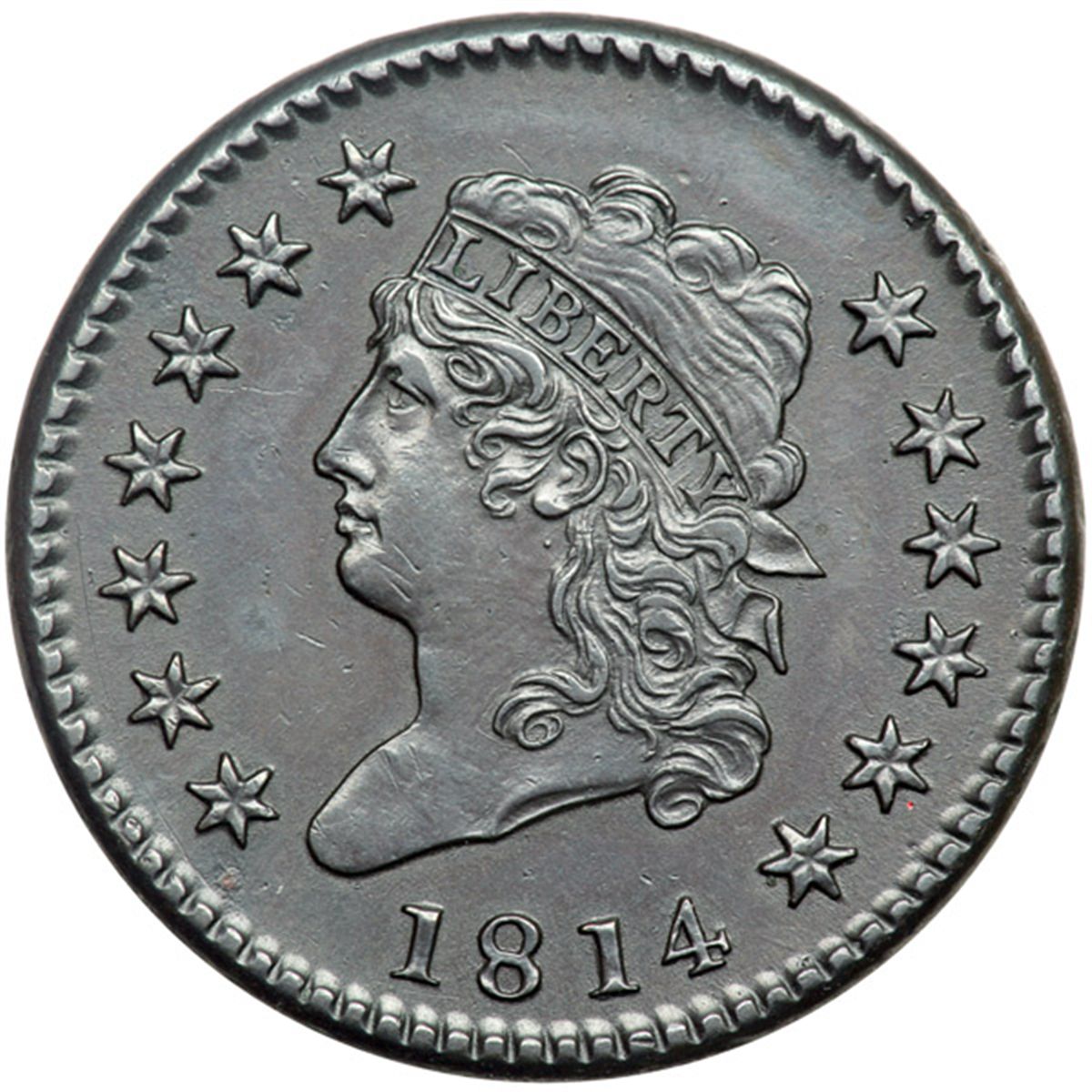 1814 S-294 R1 Turban Head, Crosslet 4 EF40. Five points sharper but there are a couple thin nicks on the chin and a few faint scratches above CEN in CENT. These marks blend perfectly into the frosty dark olive brown and steel toning and the eye appeal of this piece is excellent. Sharply struck MDS, Breen state II, showing faint die clashmarks on both sides.
