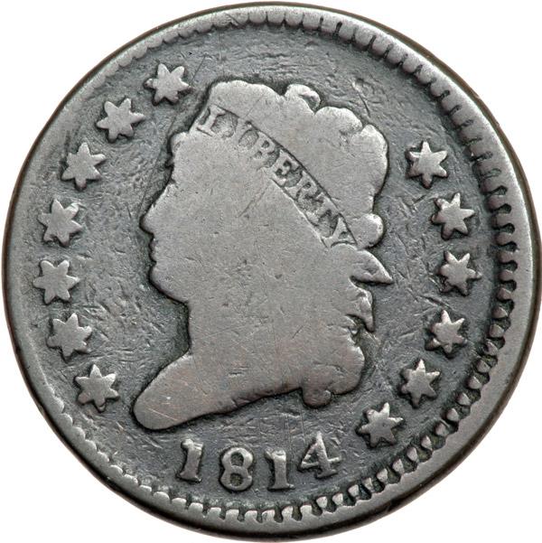 1814 S-295 R1 Plain 4 G4. Double Struck/Reverse Brockage Maker. The obverse is better while the reverse is weaker, a result of the imperfect strike(s). Glossy steel brown and chocolate. No roughness, verdigris, or notable marks. EDS. Double struck on the obverse, but the offset between impressions is insignificant and is evidenced only by obvious distortion in the dentils, clearest at stars 10-13. The reverse displays the characteristic bulging and "puffiness" seen on pieces that were struck against a blank planchet creating an incuse brockage impression. This cent was also struck slightly off center to K-10. Curious--and probably inexpensive. DWH #3416.
