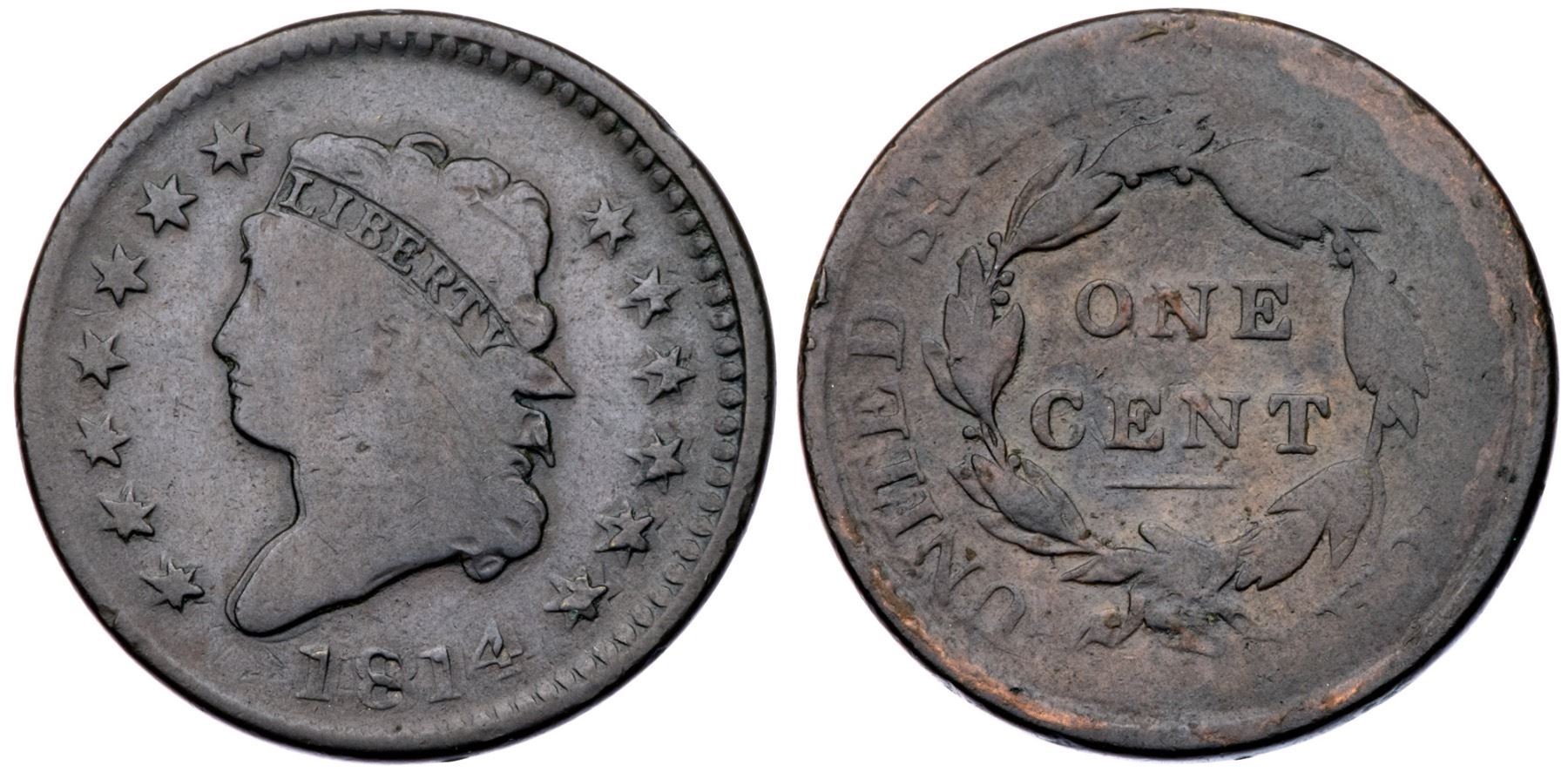 1814 S-295 R1 Plain 4 G6Glossy chocolate brown and olive with some lighter brown in protected areas on the reverse. E-MDS with a die crack through the lowest curl but no crumbling at the throat. This cent was struck two times. The first strike was normal and the second was against the obverse die on the obverse and a new blank planchet on the reverse thereby creating a reverse brockage. The doubling on the obverse is especially obvious on the date, bust, and neck with an offset of slightly less than a millimeter. The reverse is blunted and swollen, a characteristic of having been struck against a blank planchet.Certificate Number: Pedigree: Ex Stack's 9/29/1977-Richard V. Punchard-Fred H. Borcherdt Collection (includes the Punchard collection envelope)