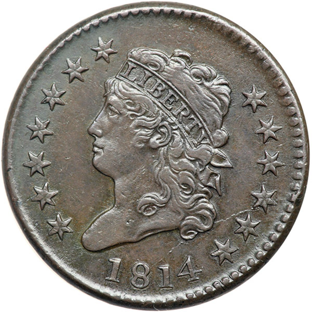 1814 S-295 R1 Turban Head, Plain 4 VF35. Choice glossy chocolate brown with flowline luster covering the protected areas. Great eye appeal, nearly perfect for the grade. A strong glass is required to find any marks and there is no hint of roughness or verdigris. MDS with a fine die crack arcing through the lowest curl. A beautiful example of a common variety, perfect for a high-quality type set.