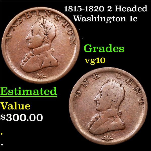1815-1820 2 Headed Washington 1c Grades vg+. Classic chocolate brown color on the obverse and