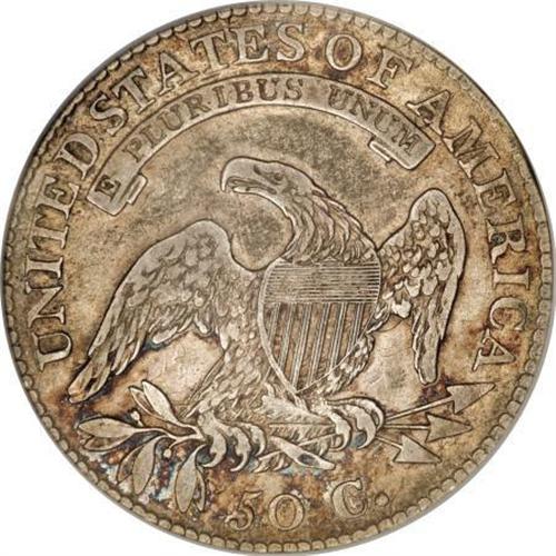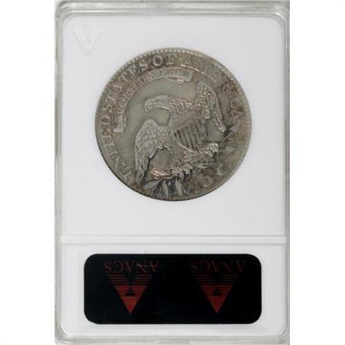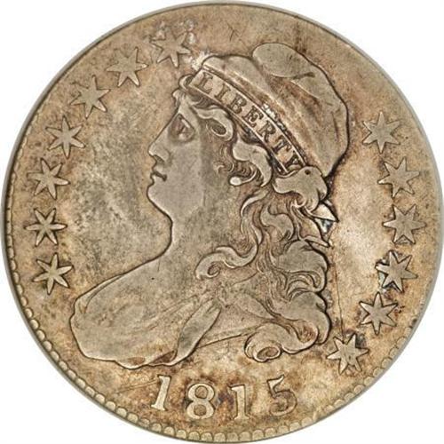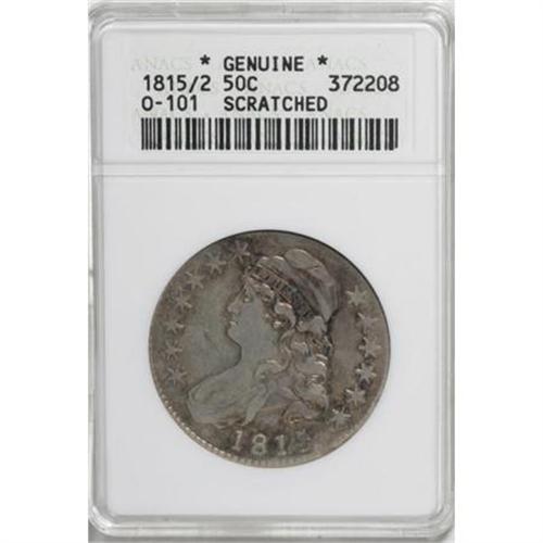 <B>1815/2 50C --Scratched--ANACS. Genuine. VF30.</B></I> O-101, R.3. The grade of this piece is our opinion, as ANACS calls the coin "Genuine" but provides no grade opinion. Other than a single long scratch behind the hair curls, the surfaces are no worse than any other circulated Bust half dollar at a similar grade level. Pale gold and iridescent toning over light silver-gray surfaces.<BR><BR><B>Coin Engraver:</B> John Reich<BR><BR><b>Shipping:</b> Coins & Currency (<a target="_blank" href="http://www.heritageauctions.com/common/shipping.php">view shipping information</a>)