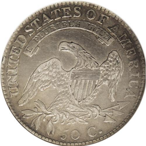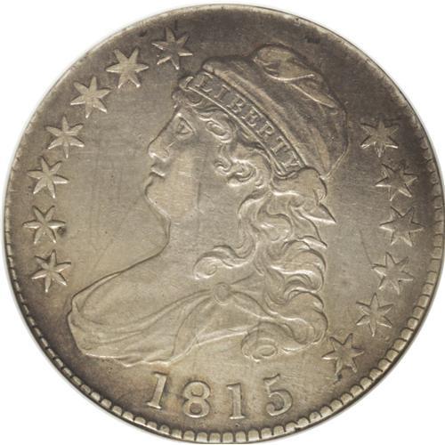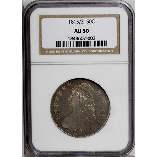 <B>1815/2<50C> AU50 NGC.</B></I> O-101, R.2. Attractive grayish-brown color with rose and pale blue toning highlights. The surfaces have faint hairlines, but none that are distracting in any way. A tiny reverse rim nick is located over the T in UNITED. Among all issues of the Capped Bust series from 1807 to 1836, this date is the only key issue. Just 47,150 coins were minted during the year. The annual coinage production for the entire year was limited to quarter dollars, half dollars, and half eagles. The latter denomination is a major rarity with only a few hundred struck. Even the quarter dollar, which is considered the only common date of the year, is becoming more and more difficult to locate.