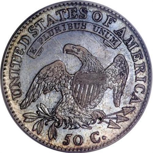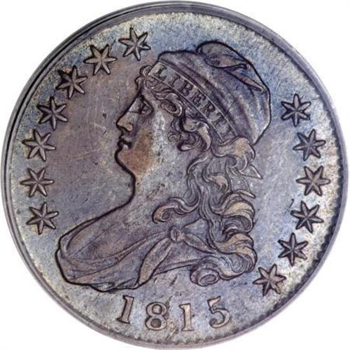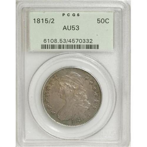<B>1815/2 50C AU53 PCGS.</B></I> O-101, R.2. The 1815/2 is the key to a date set of Capped Bust halves, and is typically encountered in VF grades. This sharply struck AU example is partly lustrous and deeply toned in ocean-blue and lilac. Careful examination locates faint marks on the cleavage and on the field near the left scroll end. Struck from multiply clashed dies, and certified in a green label holder. Population: 8 in 53, 37 finer (1/08).<BR><BR><B>Coin Engraver:</B> John Reich<BR><BR><b>Shipping:</b> Coins & Currency (<a target="_blank" href="http://www.heritageauctions.com/common/shipping.php">view shipping information</a>)