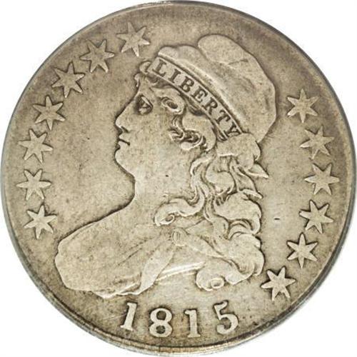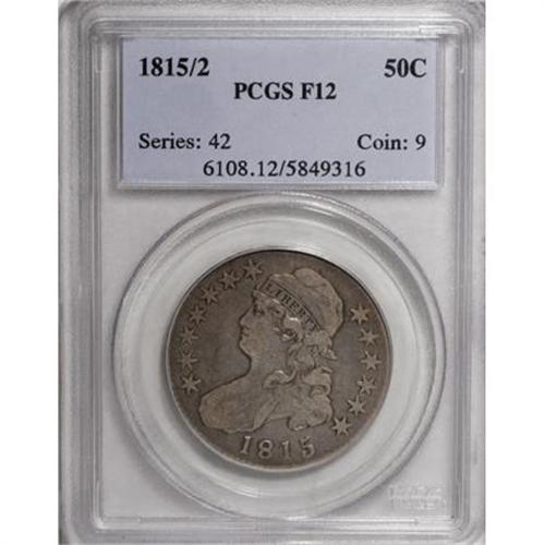 <B>1815/2 50C Fine 12 PCGS.</B></I> O-101, R.2. The 1815/2 is the stopper to a date collection of Capped Bust halves. Struck from dramatically clashed dies. Only a single 1815-dated die pair is known, an unusual situation since the half dollar was the predominant U.S. silver coin of the era. This problem-free and nicely detailed example features light to medium dove-gray and tan toning.<BR><I>From The Yoder Family Collection, Part One.</B></I><BR><BR><B>Coin Engraver:</B> John Reich<BR><BR><b>Shipping:</b> Coins & Currency (<a target="_blank" href="http://www.heritageauctions.com/common/shipping.php">view shipping information</a>)