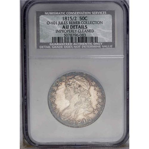 <B>1815/2<50C>--Improperly Cleaned--NCS. AU Details.</B></I> O-101, R.2. Richly toned in golden-brown and sea-green shades near the borders, and bright silver-gold in the centers, with a few wispy hairlines and noteworthy die clash marks (as struck) in the field areas. A bit irregularly struck with some of the peripheral stars weak and others fully defined. Heavily die clashed in the reverse fields. Always an important offering as there is only the one variety this year, placing heavy demand on this issue by both date and variety collectors.<BR><I>Ex: George Ramont (12/20/1983).</B></I> Envelope Included.