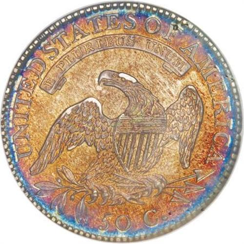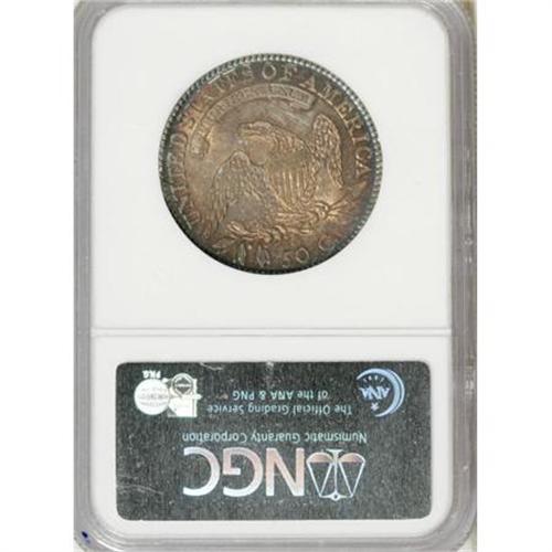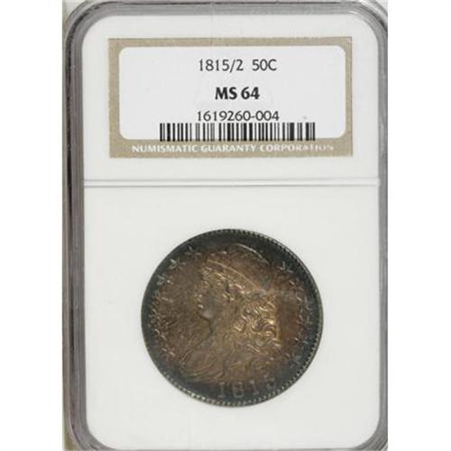 <B>1815/2 50C MS64 NGC.</B></I> O-101a, R.2. A fantastic example of this rarity that is one of the top dozen known, and tied with several at this grade level. The toning adds greatly to the allure, with rich copper-gold over lustrous surfaces framed by deep aqua-blue around the stars and legend. Both dies show minor clash marks, as seen on a substantial number of those coined in 1815. Mintage plunged to 47,150 pieces during 1815, perhaps because of the just-ended War of 1812 (which lasted until 1814), or perhaps little silver was sent to the Mint in 1815 for coinage. Disruptions continued in January 1816, when a disastrous fire struck the Philadelphia Mint outbuildings that housed the rolling equipment used for silver and gold coinage, and production all but halted for gold and silver until the equipment was repaired in late 1817. The disruptions of the War of 1812 brought coinage production virtually to a halt in 1815. No half cents, large cents, half dimes, dimes, dollars, quarter eagles or eagles were produced, just a handful of quarters and half dollars and a token amount of half eagles were coined. Most of the 1815 coinage produced was distributed through the Planter's Bank of New Orleans. Even the Economite Hoard, which contained 111,356 Bust half dollars, had a scant 100 specimens dated 1815. Most of the coins from that famous hoard were badly scrubbed, and today would grade XF to AU. How this particular coin survived in such superlative condition is a mystery, but here it is in all its glory. NGC and PCGS have graded a combined nine pieces this high, with a mere four coins seen finer of this date (11/07).<BR><I>Ex: Bowers and Merena (1/03), lot 310.</B></I><BR><BR><B>Coin Engraver:</B> John Reich<BR><BR><b>Shipping:</b> Coins & Currency (<a target="_blank" href="http://www.heritageauctions.com/common/shipping.php">view shipping information</a>)
