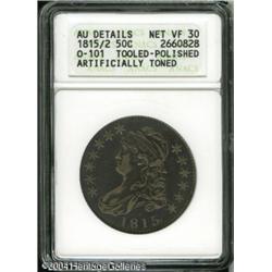 1815/2 50C --Tooled, Polished, Artificially Toned--AN <B>1815/2 50C --Tooled, Polished, Artificially Toned--ANACS. AU Details, Net VF30.</B></I> O-101, R.2. The only dies, as is the case for the Bust Quarter of the same year. Glossy from polishing, and deeply toned in mauve-brown and tan-gray colors. No tooling is readily evident. <BR><BR><B>Important notice:</B> Heritage usually auctions material at the rate of 200-250 lots per hour. On some occasions eBay Live bid software or the Internet may not be able to keep up with the pace of the auction. We recommend placing a realistic absentee bid now as insurance to avoid disappointment. Occasionally the auctioneer may eliminate or reject an eBay Live bid, and the auctioneer may also reopen a lot after the close of the eBay live bidding (usually because we missed an audience bid), and may reject your bid even if it shows you as the winning bidder. By bidding via eBay Live, you agree that Heritage may award the lot to another bidder at its sole discretion under the circumstances described above or any other reasonable circumstances. Since eBay bids are not shown to us until we open the lot on the floor, we treat those bids just like floor bids. In most cases the floor responds before the eBay bid is presented to us, due to Internet lag time, so for consistency we have made it a policy that floor bids are always considered first over tie eBay live bids. Also please note that all Heritage lots purchased through eBay Live carry a 20% Buyer's Premium. Please make sure you read the Terms and Conditions before you bid. This lot is being auctioned in conjunction with a live floor auction by Heritage Galleries & Auctioneers. All final auction and invoice information will be supplied by Heritage Galleries & Auctioneers, and all other information should be considered preliminary. Lot:6054
