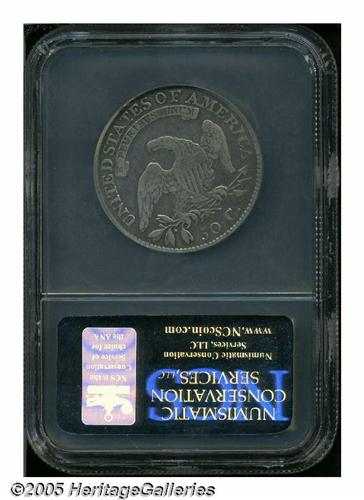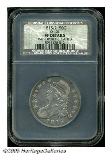 <B>1815/2<50C> VF Details, Improperly Cleaned, NCS.</B></I> O-101, R.2. Glossy from a moderate cleaning, the steel-gray fields exhibit wispy hairlines. A few moderate marks, but these do not require individual mention. Only one die pairing is known for the 1815, which shows traces of an underdigit 2 about the 5 in the date.