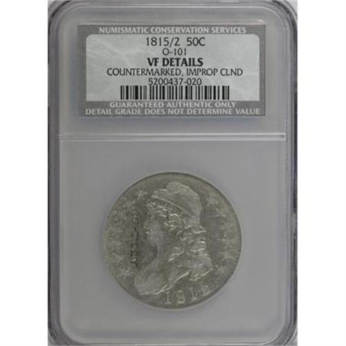 <B>1815/2 50C --Countermarked, Improperly Cleaned--NCS. VF Details.</B></I> O-101, R.2. "AUG. 1 - 48" has been vertically counterstamped on the left obverse field. The counterstamp was entered as a single gang punch, and causes the reverse to bulge near the left scroll end. Probably exposed to baking soda at one time, but a richly detailed example of this low mintage date.<BR><BR><B>Coin Engraver:</B> John Reich<BR><BR><b>Shipping:</b> Coins & Currency (<a target="_blank" href="http://www.heritageauctions.com/common/shipping.php">view shipping information</a>)