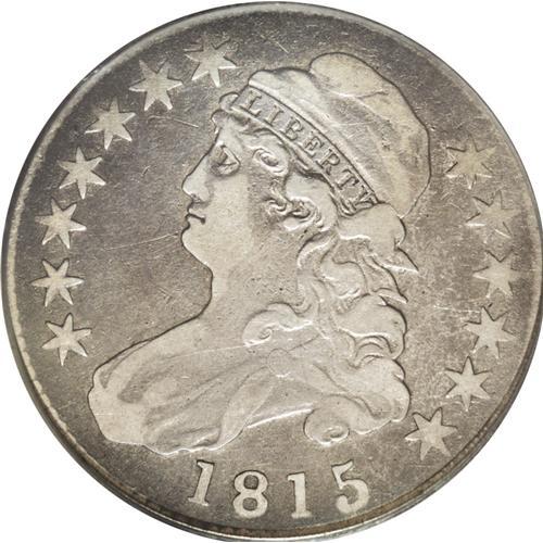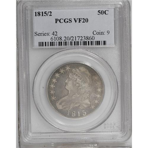 <B>1815/2<50C> VF20 PCGS.</B></I> O-101, R.2. Shades of gray from cream to lavender embrace this attractively detailed key date Capped Bust half. The shield lines are virtually fully separated, and the eagle has substantial plumage definition. The minutely granular surfaces exhibit only one mark visible with the unaided eye, a pinscratch located near Liberty's chin.