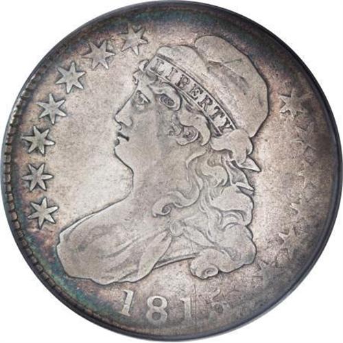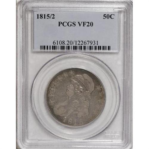 <B>1815/2 50C VF20 PCGS.</B></I> O-101, R.2. An accurately assigned grade by PCGS. Despite strike weakness along the right obverse periphery and the denomination on the reverse, this piece displays overall wear commensurate with a VF20 Capped Bust half dollar. Attractive gunmetal-gray surfaces are gently framed by occasional blushes of electric-blue at russet toning at the rims. An eye-appealing, original example of this popular early half. Previously part of a Coin Galleries auction, July 18, 1990, lot 2542 (envelope included).<BR><I>From The John Stimson, Sr. Collection, Part One.</B></I><BR><BR><B>Coin Engraver:</B> John Reich<BR><BR><b>Shipping:</b> Coins & Currency (<a target="_blank" href="http://www.heritageauctions.com/common/shipping.php">view shipping information</a>)