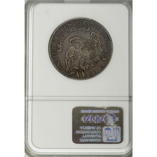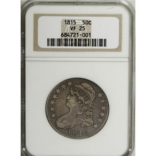 <B>1815/2 50C VF25 NGC.</B></I> O-101, R.2. At the VF25 level, the 1815 half is accessible to a wider group of collectors. This date is important because of its limited availability in only one die pairing. The devices show even wear, and the only noticeable mark is an old scratch in the upper left obverse field. Original medium gray toning with much lighter accents over the highpoints.<BR><I>From The Jones Beach Collection.</B></I><BR><BR><b>Shipping:</b> Coin/Currency (<a target="_blank" href="http://www.heritageauctions.com/common/shipping.php">view shipping information</a>)
