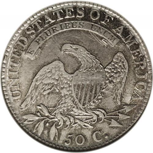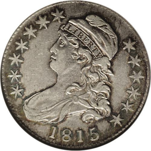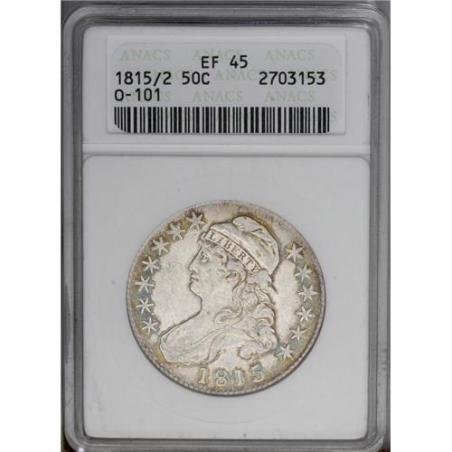 <B>1815/2<50C> XF45 ANACS.</B></I> O-101, R.2. Lovely honey-gold and ocean-blue colors adorn the margins, while the fields and devices are untoned. Multiple clash marks, as produced, are prominent on both sides. The only remotely relevant mark is a pinscratch beneath the chin. As a die marriage, O-101 is not rare. However, similar to the 1804 Large Cent, it is the only variety for the date and thus becomes a key to the series. <BR><BR><B>Important notice:</B> Heritage usually auctions material at the rate of 200-250 lots per hour. On some occasions eBay Live bid software or the Internet may not be able to keep up with the pace of the auction. We recommend placing a realistic absentee bid now as insurance to avoid disappointment. Occasionally the auctioneer may eliminate or reject an eBay Live bid, and the auctioneer may also reopen a lot after the close of the eBay live bidding (usually because we missed an audience bid), and may reject your bid even if it shows you as the winning bidder. By bidding via eBay Live, you agree that Heritage may award the lot to another bidder at its sole discretion under the circumstances described above or any other reasonable circumstances. Since eBay bids are not shown to us until we open the lot on the floor, we treat those bids just like floor bids. In most cases the floor responds before the eBay bid is presented to us, due to Internet lag time, so for consistency we have made it a policy that floor bids are always considered first over tie eBay live bids. Also please note that all Heritage lots purchased through eBay Live carry a 20% Buyer's Premium. Please make sure you read the Terms and Conditions before you bid. This lot is being auctioned in conjunction with a live floor auction by Heritage Galleries & Auctioneers. All final auction and invoice information will be supplied by Heritage Galleries & Auctioneers, and all other information should be considered preliminary. Lot:1940 <BR><BR><B>Winning Notification and Billing:</B> After the FINAL session in this auction is complete, Heritage will send e-mail and snail mail invoices. This process normally takes several days. All final auction and invoice information will be supplied by Heritage Galleries & Auctioneers, and all other information should be considered preliminary. <BR><BR>This auction will be conducted on a live auction floor and over the Internet through eBay Live. If you choose to place an absentee bid, please take a moment to <font color='#0000ff'><u><a href='http://pages.ebay.com/liveauctions/help/before/laabsentee.html'>learn how eBay Live absentee bidding works</a></u></font><font color='#000000'>