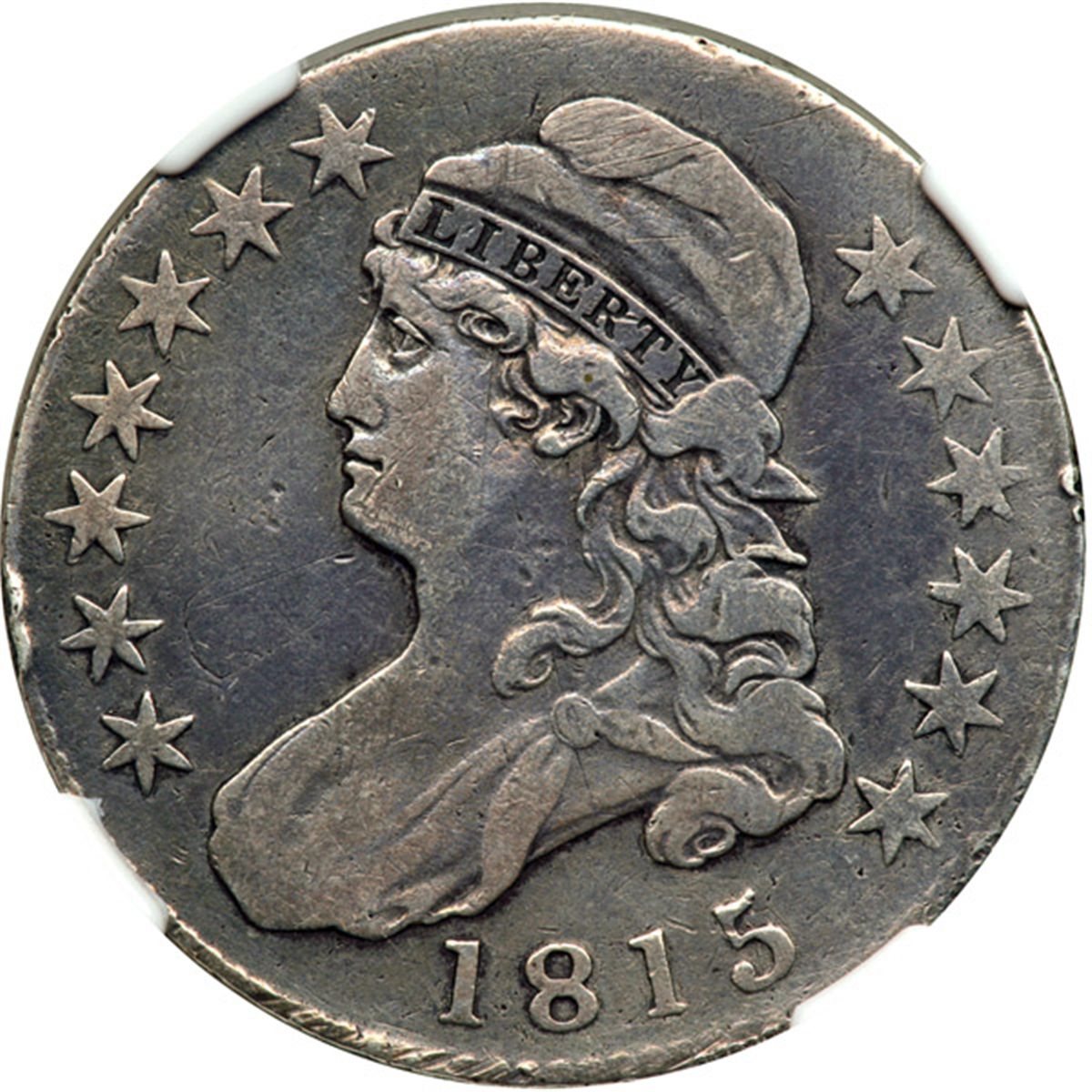 1815 Capped Bust Half Dollar. 5 over 2. NGC VF Details, improperly cleaned. Now toned light to medium grayish-violet. Popular rare Key Date bust half.