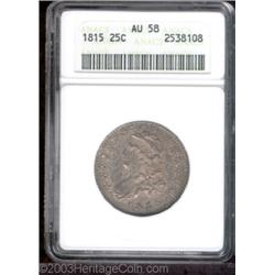 <TABLE cellSpacing=0 cellPadding=0 width="100%" bgColor=#000000 border=0><TBODY><TR><TD width="100%"><TABLE cellSpacing=1 cellPadding=3 width="100%" border=0><TBODY><TR><TD width="100%" bgColor=#79735c><FONT face=arial color=#ffffff size=3><B>Description</B> </FONT></TD></TR><TR><TD width="100%" bgColor=#ffffff><FONT face=arial size=2><B>1815 25C AU58 ANACS.</B></I> B-1, R.1. Freckles of lavender, aqua, and slate-gray patina. A sharply struck piece with modest shimmering luster and pleasing surfaces. An impressive type coin. </FONT></TD></TR></TBODY></TABLE></TD></TR></TBODY></TABLE><BR><A name=PricesRealized></A><TABLE cellSpacing=0 cellPadding=0 width="100%" bgColor=#000000 border=0><TBODY><TR><TD width="100%"><TABLE cellSpacing=1 cellPadding=3 width="100%" border=0><TBODY><TR><TD width="100%" bgColor=#79735c><A name=PR><FONT face=arial color=#ffffff size=3><B>Previous Prices from Heritage Auctions</B> </FONT></A></TD></TR><TR><TD bgColor=#f6f6ed><TABLE cellSpacing=0 cellPadding=0 width="100%" border=1><TBODY><TR><TD align=middle width="33%"><B>Date</B></TD><TD align=middle width="33%"><B>Service</B></TD><TD align=middle width="33%"><B>Price</B></TD></TR><TR bgColor=whitesmoke><TD width="33%"><B>01/01/1995</B></TD><TD width="33%">NGC</TD><TD width="33%">$1,540.00</TD></TR></TBODY></TABLE></TD></TR><TR><TD bgColor=#ffffff><FONT face=arial size=1 ?>PLEASE NOTE: All prices realized reflect the final hammer price PLUS the buyer's premium in auctions that charge a buyer's premium. Each item has a notation at the top of the listing indicating whether that lot included a buyer's premium. Example: A item that sells with a final hammer price of $100 and a 20% buyer's premium will display with a price realized of $120. All information listed is intended to be as accurate as possible, but errors are possible. Please use this guide carefully and inform us of any inaccuracies. </FONT></TD></TR></TBODY></TABLE></TD></TR></TBODY></TABLE><BR><TABLE cellSpacing=0 cellPadding=0 width="100%" bgColor=#000000 border=0><TBODY><TR><TD width="100%"><TABLE cellSpacing=1 cellPadding=3 width="100%" border=0><TBODY><TR><TD width="100%" bgColor=#79735c colSpan=6><FONT face=arial color=#ffffff size=3><B>Price Guide*</B> </FONT></TD></TR><TR bgColor=#f6f6ed><TD align=middle><B>Grade</B> </TD><TD align=middle><B>Coin World<BR>(Trends)</B> </TD><TD align=middle><B>Numismedia<BR>Retail</B> </TD><TD align=middle><B>Numismedia<BR>Wholesale</B> </TD><TD align=middle><B>Coin<BR>Universe</B> </TD><TD align=middle><B>Heritage<BR>Value Index</B> </TD></TR><TR bgColor=#ffffff><TD align=middle>55</TD><TD align=right>$1,450.00</TD><TD align=right>---</TD><TD align=right>$1,400.00</TD><TD align=right>$1,275.00</TD><TD align=right>$1,014.58</TD></TR><TR style="FONT-WEIGHT: bold" bgColor=#cccfdd><TD align=middle>58</TD><TD align=right>---</TD><TD align=right>---</TD><TD align=right>$1,625.00</TD><TD align=right>---</TD><TD align=right>$1,297.83</TD></TR><TR bgColor=#ffffff><TD align=middle>60</TD><TD align=right>$2,100.00</TD><TD align=right>---</TD><TD align=right>$1,700.00</TD><TD align=right>$2,150.00</TD><TD align=right>$1,486.67</TD></TR><TR bgColor=#ffffff><TD colSpan=6><FONT size=1>*All information listed is intended to be as accurate as possible, but errors are possible. No item may be returned or refused based on this information which is provided as a service to our customers. You should contact each pricing source directly to determine the accuracy of this information. </FONT></TD></TR></TBODY></TABLE></TD></TR></TBODY></TABLE><BR><TABLE cellSpacing=0 cellPadding=0 width="100%" bgColor=#000000 border=0><TBODY><TR><TD width="100%"><TABLE cellSpacing=1 cellPadding=3 width="100%" border=0><TBODY><TR><TD width="100%" bgColor=#79735c><FONT face=arial color=#ffffff size=3><B>Population Guide</B> </FONT></TD></TR><TR bgColor=#ffffff><TD align=middle><!-- Begin Output of Population Grid--><TABLE cellSpacing=0 cellPadding=0 width="100%" border=0><TBODY><TR><TD vAlign=center><TABLE cellSpacing=0 width="100%" border=1 cellsadding="3"><TBODY><TR><TD vAlign=center><TABLE cellSpacing=0 cellPadding=3 width="100%" border=1><TBODY><TR><TD vAlign=center align=middle bgColor=#f0f1e8 colSpan=2 <CENTER><FONT face=Arial size=2><B>PCGS Pop </B></FONT><CENTER></CENTER></TD><TD vAlign=center align=middle bgColor=#f0f1e8 colSpan=2><CENTER><FONT face=Arial size=2><B>NGC Pop</B></CENTER></FONT></TD></TR><TR><TD vAlign=center><FONT face=Arial size=2>(58)</FONT> </TD><TD vAlign=center align=right><FONT face=Arial size=2>1</FONT> </TD><TD vAlign=center><FONT face=Arial size=2>(58)</FONT> </TD><TD vAlign=center align=right><FONT face=Arial size=2>14</FONT> </TD></TR><TR><TD vAlign=center><FONT face=Arial size=2>(>58)</FONT> </TD><TD vAlign=center align=right><FONT face=Arial size=2>34</FONT> </TD><TD vAlign=center><FONT face=Arial size=2>(>58)</FONT> </TD><TD vAlign=center align=right><FONT face=Arial size=2>37</FONT> </TD></TR></TBODY></TABLE></TD></TR></TBODY></TABLE></TD></TR></TBODY></TABLE><!-- End Output of Population Grid--> Important notice: Heritage usually auctions material at the rate of 200-250 lots per hour. On some occasions eBay Live bid software or the Internet may not be able to keep up with the pace of the auction. We recommend placing a realistic absentee bid now as insurance to avoid disappointment. Occasionally the auctioneer may eliminate or reject an eBay Live bid, and the auctioneer may also reopen a lot after the close of the eBay live bidding (usually because we missed an audience bid), and may reject your bid even if it shows you as the winning bidder. By bidding via eBay Live, you agree that Heritage may award the lot to another bidder at its sole discretion under the circumstances described above or any other reasonable circumstances. Also please note that all Heritage lots purchased through eBay Live carry a 20% Buyer's Premium. Please make sure you read the Terms and Conditions before you bid.</TD></TR></TBODY></TABLE></T