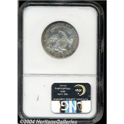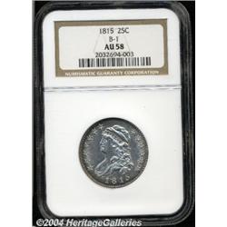 <B>1815<25C> AU58 NGC.</B></I> B-1, R.1. Untoned through the centers with a hard, satiny sheen that shows only the slightest break on the highpoints of the portrait. Bits of golden-violet toning form outside the peripheral devices on the obverse.<BR><I>Ex: Kreisberg, Schulman Sale (5/66), lot 1944, where it realized $400.</B></I> <BR><BR><B>Important notice:</B> Heritage usually auctions material at the rate of 200-250 lots per hour. On some occasions eBay Live bid software or the Internet may not be able to keep up with the pace of the auction. We recommend placing a realistic absentee bid now as insurance to avoid disappointment. Occasionally the auctioneer may eliminate or reject an eBay Live bid, and the auctioneer may also reopen a lot after the close of the eBay live bidding (usually because we missed an audience bid), and may reject your bid even if it shows you as the winning bidder. By bidding via eBay Live, you agree that Heritage may award the lot to another bidder at its sole discretion under the circumstances described above or any other reasonable circumstances. Since eBay bids are not shown to us until we open the lot on the floor, we treat those bids just like floor bids. In most cases the floor responds before the eBay bid is presented to us, due to Internet lag time, so for consistency we have made it a policy that floor bids are always considered first over tie eBay live bids. Also please note that all Heritage lots purchased through eBay Live carry a 20% Buyer's Premium. Please make sure you read the Terms and Conditions before you bid.