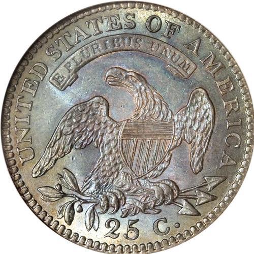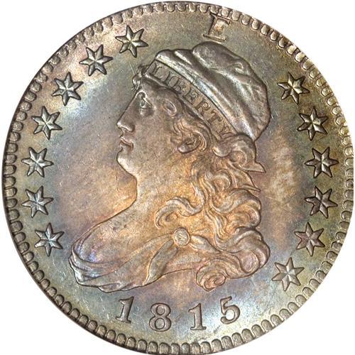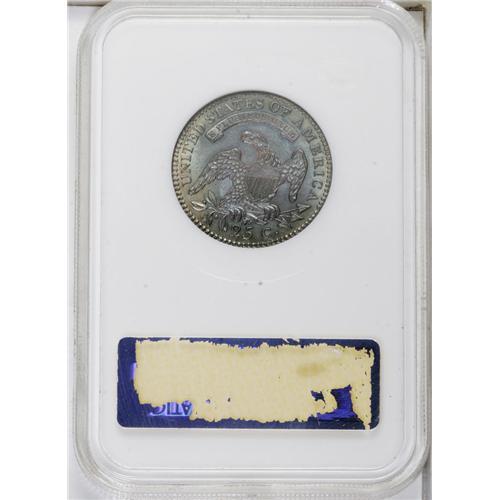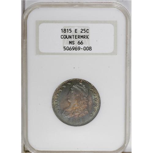 <B>1815 25C E Countermark MS66 NGC.</B></I> B-1, R.1. Numerous theories have been proposed concerning the enigmatic E and L counterstamped Bust quarters, which began to appear in numismatic circles in the second half of the 19th century. Current speculation is that the Economite religious community in Pennsylvania counterstruck these pieces as a voting measure. The E and L counterstamps represented rival factions within the Economites. This is a remarkable example of the E counterstamp. Ocean-blue and orange toning graces lustrous and sharply struck surfaces. Void of any relevant marks, and encapsulated in a prior generation NGC holder. Census: 5 in 66, 1 finer (10/06).<BR><BR><b>Shipping:</b> Coin/Currency (<a target="_blank" href="http://www.heritageauctions.com/common/shipping.php">view shipping information</a>)