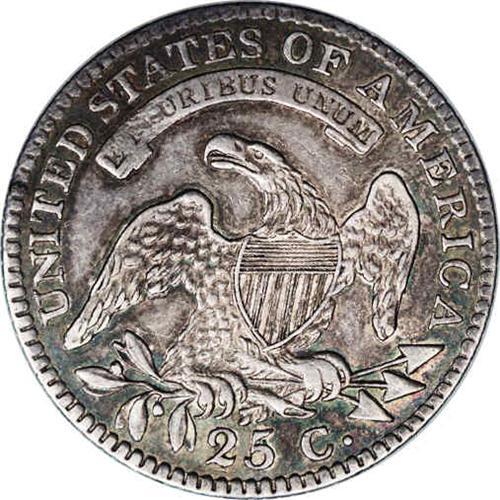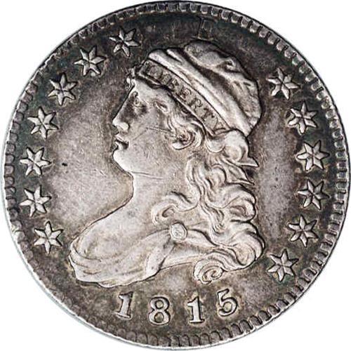 <B>1815<25C> "E" Counterstamp B-1, R.6--Bent--NCS. AU Details. Die State I.</B></I> Wide Date; AT repunched. The "E" counterstamp shows above Liberty's head. A certain number of 1825 quarters also exist with the E counterstamp, and both dates also exist with an "L" counterstamped above the head. Many hypotheses have been presented to explain these E and L counterstamped coins, however, none to date have been proven. Most recently, a plausible suggested links these coins to the Economite Hoard of silver coinage uncovered in western Pennsylvania. Given that many of these turned up in western Pennsylvania and eastern Ohio (Economy, PA is northwest of Pittsburgh and southeast of Youngstown, Ohio), this suggestion is as good as any yet proposed. Pleasing mauve-gray surfaces with cobalt-blue accents. Minor obverse scratches, and slight deformation in the area around C. of 25 C. from the obverse counterstamp.<BR><I>Ex: Julian Leidman (4/1986).</B></I> Envelope Included.