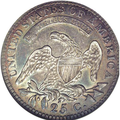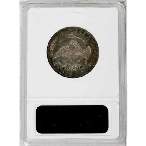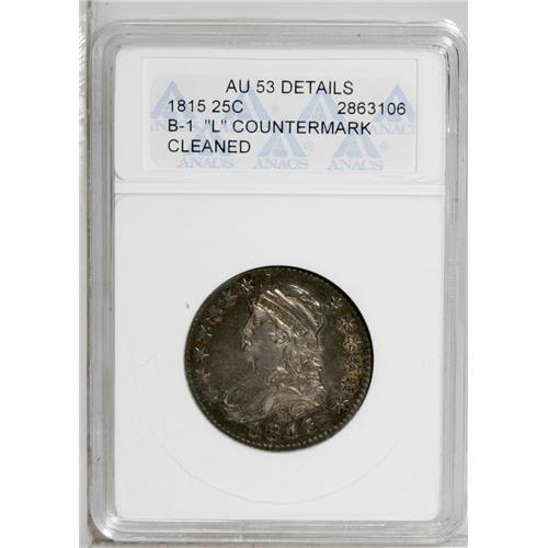 <B>1815<25C>--"L" Countermark, Cleaned--ANACS. AU53 Details.</B></I> B-1, R.1. The "E" and "L" countermarked quarters of 1815 and 1825 have fascinated and frustrated numismatists since their first documented appearance 1881. Certain peculiarities of these coins are generally accepted as truisms by most of the numismatic community. First, virtually all pieces grade from XF to Uncirculated. Second, the E and L letter punches utilize similar scripts, and the resultant letters exhibit a consistent location relative to Liberty's head (the E sits directly over the cap, while the L sits left of the cap's peak). Third, the E countermark appears to be more plentiful than the L, and there seems to be more 1815 coins than 1825 examples. Fourth, the coins first appeared (1881) in the Tri-State area around Pittsburgh, and made a second appearance in 1968-1972 in the same area.<BR> Numerous theories have been proposed to explain these enigmatic coins. These range from suggestions that the countermarks were applied at the Mint, perhaps to identify the coin's weight (<B>L</B></I> ight vs. <B>E</B></I> xcess), or for some sort of "test" purposes, through their use as school prizes (<B>E</B></I> nglish vs. <B>L</B></I> atin), to their being indicators of ownership. An interesting working hypothesis advanced by Ted McAuley in the July 2004 <I>John Reich Journal</B></I> connects these coins to the 19th century "Harmony" or "Economite" Society in Economy, Pennsylvania. He suggests that they served as either voting or accounting tokens during the "Great Schism" that developed in the Society in the early 1830s between George Rapp, founder and spiritual leader or the Harmonists or Economites (E) and a dissenter, Count Leon (L). The 1815 and 1825 dates, according to McCauley, were the founding dates of the Society's last two settlements, and may have reflected the seniority status of the voters and the weight of their financial cl