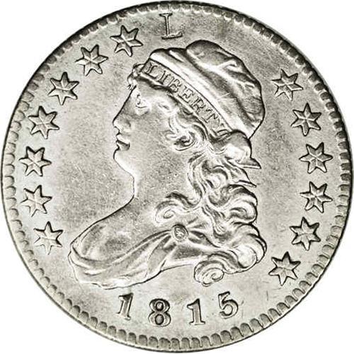 <B>1815<25C> "L" Counterstamp B-1, R.5--Improperly Cleaned--NCS. AU Details. Die State I.</B></I> Wide Date; AT repunched. The enigmatic "L" counterstamp is seen at the top front of Liberty's cap. The design elements display sharp details, and the surfaces are devoid of mentionable abrasions, but do show evidence of a harsh cleaning. Retoning light gray and powder-blue.<BR><I>Ex: William Subjack; Coin Galleries (3/1991), lot 2417.</B></I> Envelope Included.